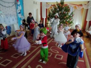 казковий герой Ялинка-веселинка (Єремеєва Л.М.) приготувала сюрпризи для малят – цукерки, горішки та мандаринки, з якими вони танцювали. Діти із задоволенням грали, співали, декламували вірші та розважали Ялинку, яка від радості аж засвітилася та ще й начарувала кожному новорічний подаруночок.